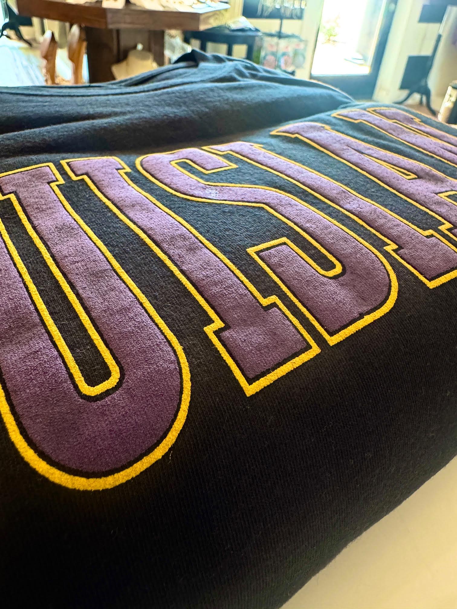 LOUISIANA PUFF DESIGN CROP TEE IN BLACK (RAISED DESIGN FOR ADDED UNIQUENESS AND TEXTURE) / BOXY LONG CROP THAT HITS AT BELT LINE FOR MOST